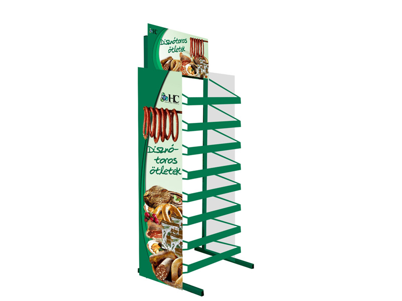 Nagy mennyiségű termék kihelyezhető a displayen. A display két oldalán és tetején céglogót, grafikát helyezhetünk el. Szétszedhető, állítható magasságú, egyedi tervezésű display.