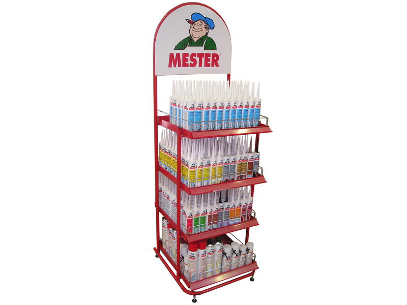Nagy teherbírású, flakonos termékek kihelyezésére alkalmas lemezes polcokkal felszerelt display. Oldalán krómozott korlátokkal felül matricázható koronával. Közkedvelt display típus.